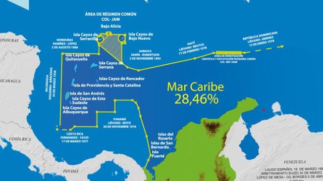 Es de señalar que anteriormente la Corte de la Haya, concedió a Nicaragua 100 millas al norte y sur del Archipiélago de San Andrés, donde fuese invocado para tal decisión, las nuevas reglas del Derecho Internacional al Mar, con lo cual se frenó el reclamo de Colombia que mantenía por más de un siglo en su posesión y dominio de esa franja del mar Caribe que era hasta el meridiano 82 y al correr unos puntos por el fallo del 2012, llega solo hasta el meridiano 80.