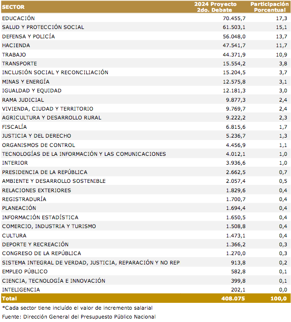 Con lo aprobado en la plenaria de la Cámara tras un fuerte debate, se espera que en 2024 el país ejecute inversiones por $224,5 billones. Además de los $99,9 billones del PGN están programados recursos del Sistema General de participaciones (SGP) por $70,5 billones, del Sistema General de Regalías (SGR) por $14,1 billones e ingresos territoriales por $40,1 billones.