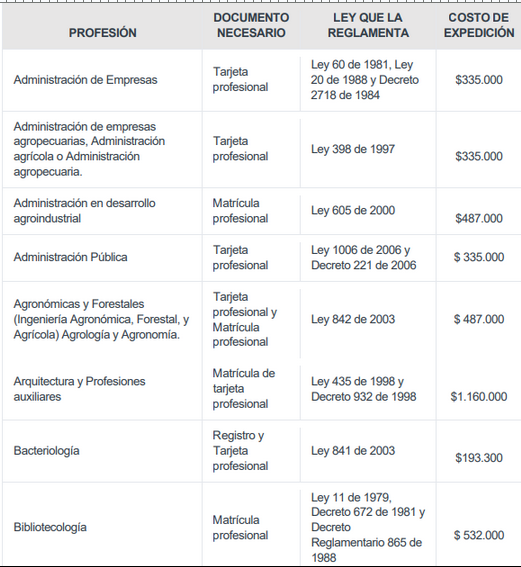 Listado de las profesiones que requieren para su ejercicio de la expedición de tarjeta o matrícula profesional y la ley que las reglamenta. Tomado de la página del Departamento Administrativo de la Función Pública: